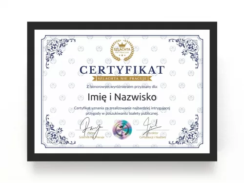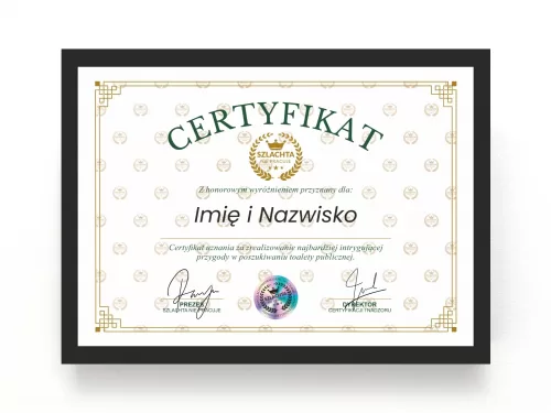 Certyfikat uznania za zrealizowanie najbardziej intrygującej przygody w poszukiwaniu toalety publicznej
