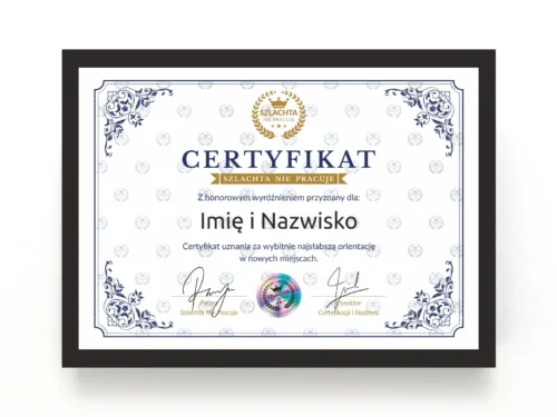 Certyfikat uznania za nieustanne imprezowanie, godne prawdziwego szlachcica